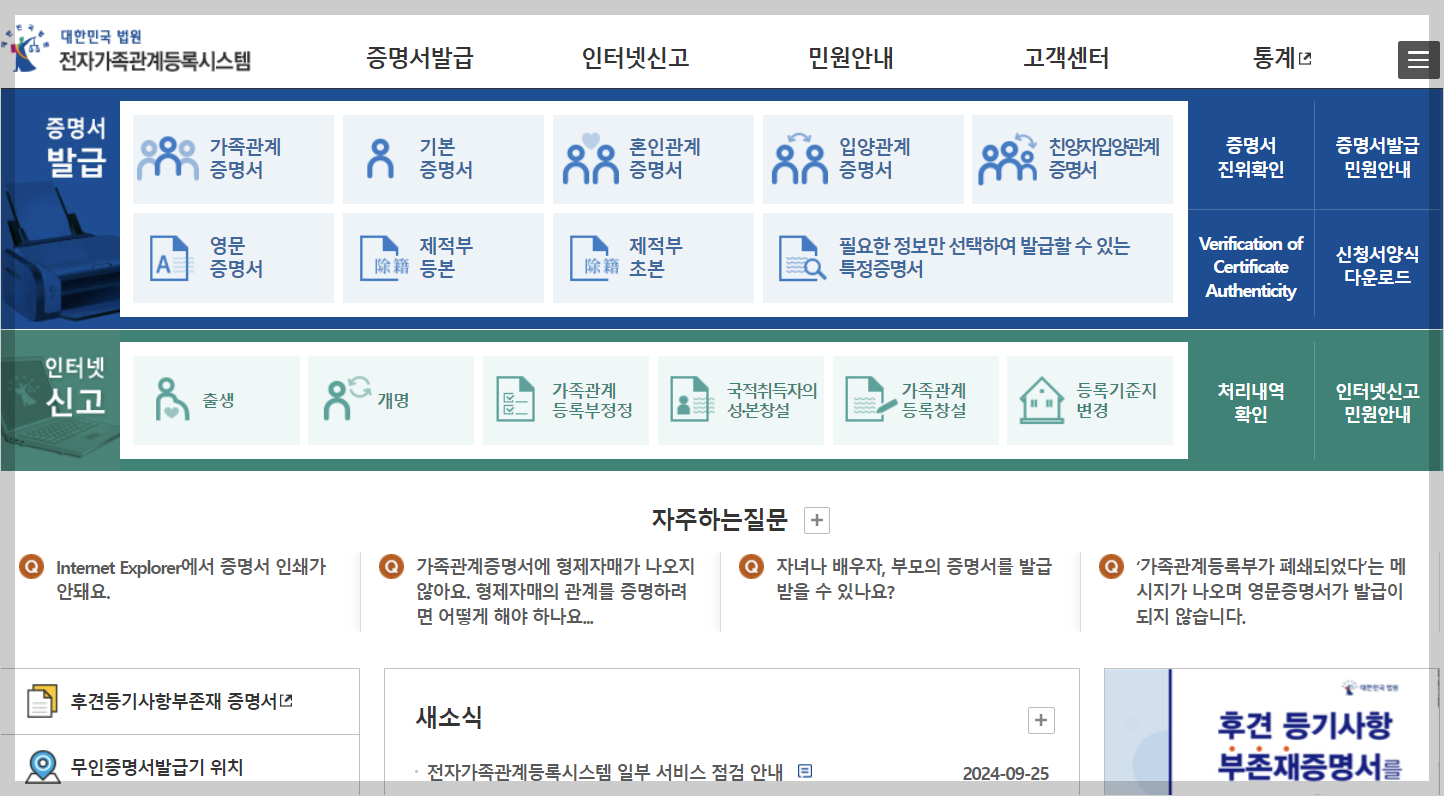 '전자가족관계등록시스템' 사이트에 들어가세요. 여기서 다양한 행정 서비스를 이용할 수 있어요.