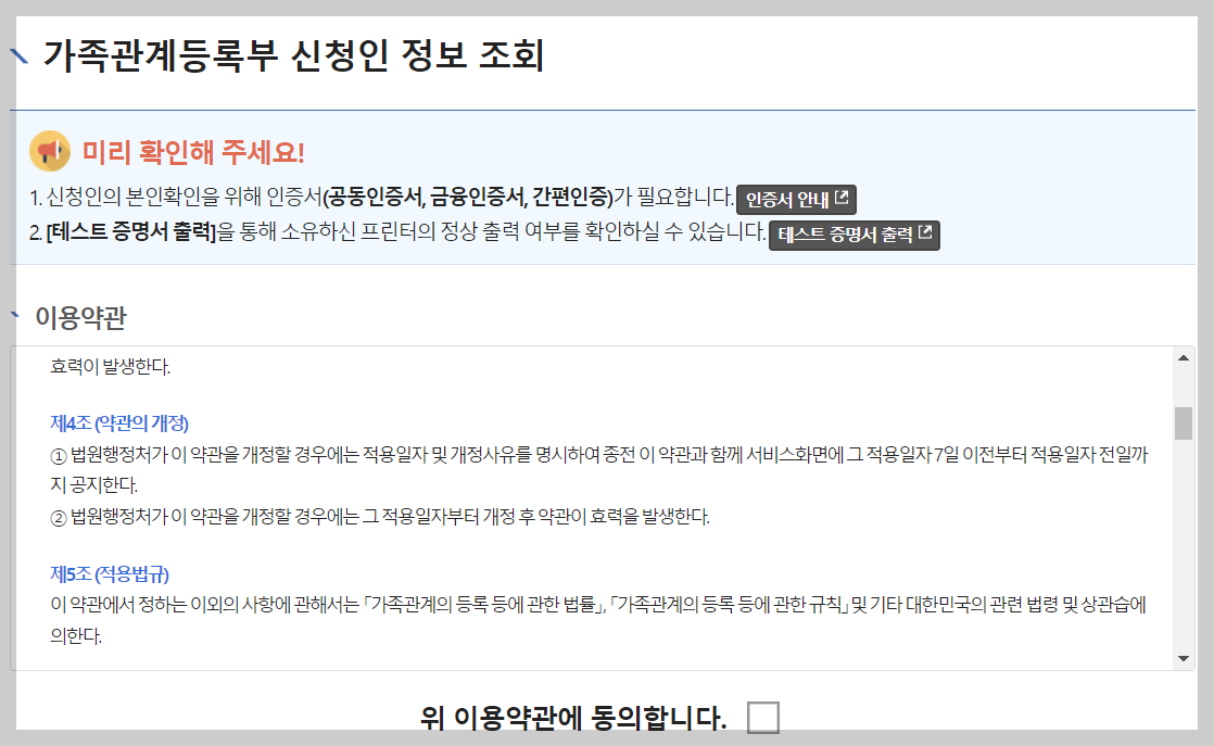 2. 가족관계등록부 신청인 정보 조회 화면에서 약관에 동의하세요.