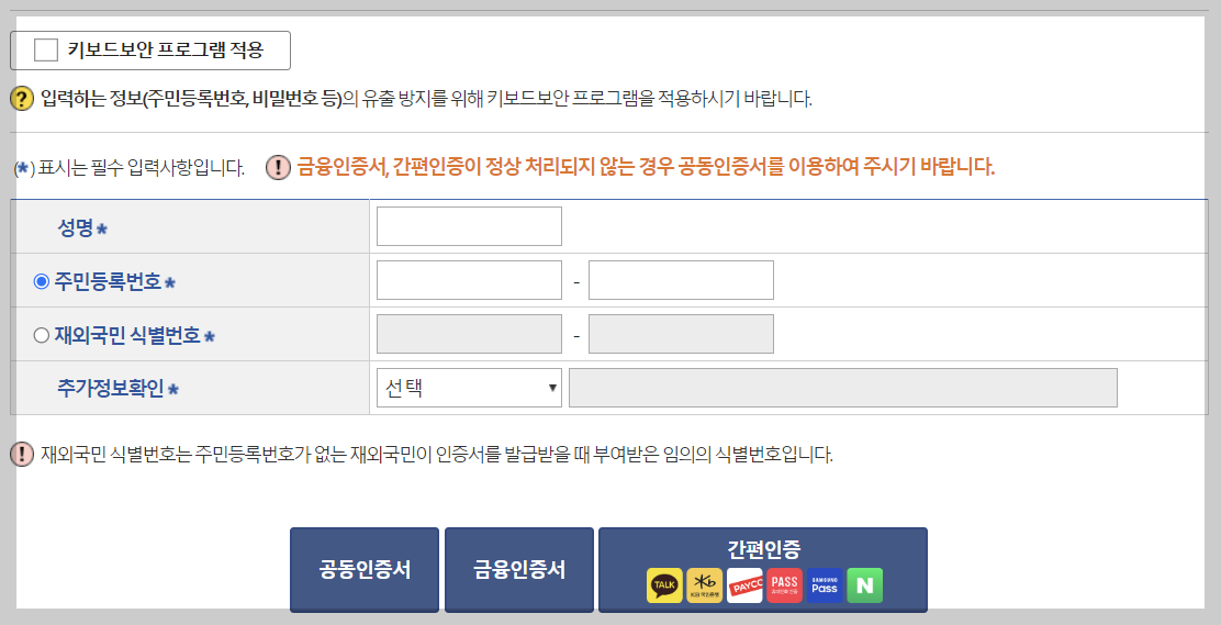 '신청인의 본인확인을 위해 인증서(공인인증서, 금융인증서, 간편인증)이 필요합니다!