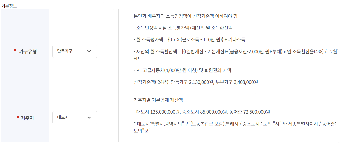 🚩소득 요건: 기준 중위소득의 70% 이하여야 합니다. 2024년 기준 중위소득은 매년 조정되므로 최신 정보를 확인하는 것이 중요합니다.