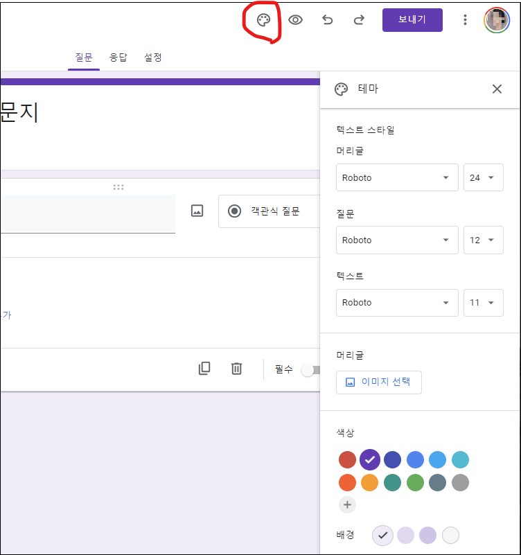 이제 폼의 디자인을 바꿔볼까요? 상단의 페인트 팔레트 아이콘을 클릭하면 다양한 테마와 색상을 선택할 수 있어요. 좀 더 눈에 띄고 예쁜 폼을 만들면 응답자들도 더 흥미를 느낄 거예요!