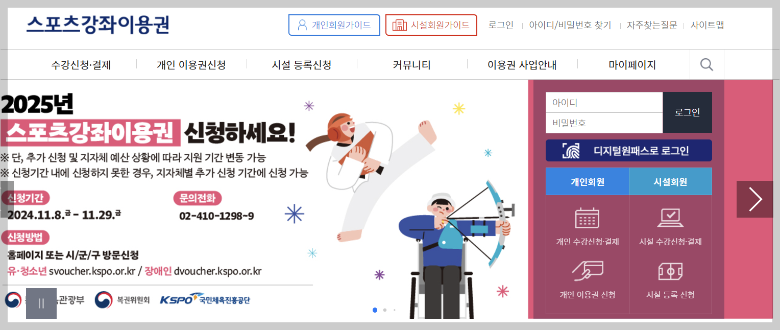 1. 누리집 접속 : 스포츠강좌이용권 누리집에 접속합니다. https://svoucher.kspo.or.kr/