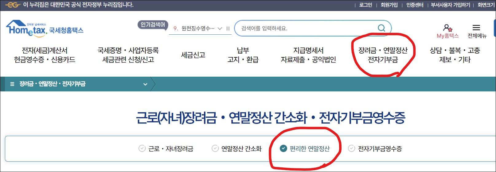 2. 상단 메뉴 중 [장려금.연말정산.전자기부금] 메뉴를 클릭하면 하단에 '편리한 연말정산' 메뉴가 보입니다. 클릭!