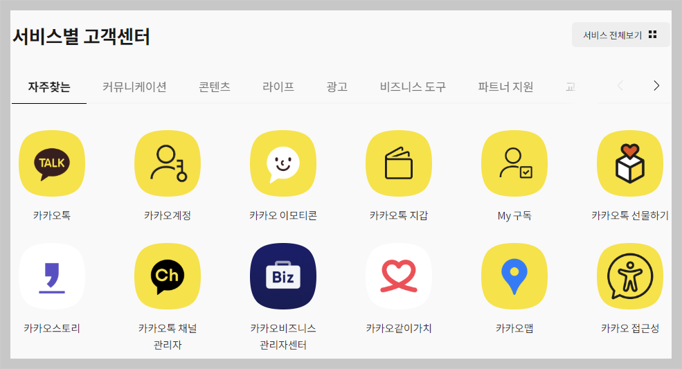 1. 서비스별 고객센터(문의 유형별 지원)