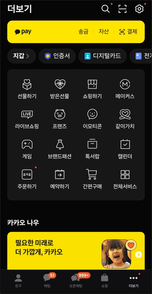 1. 카톡을 열고 우측 하단의 점 3개를 누른 후 > 우측 상단의 톱니바퀴를 터치해주세요