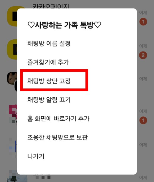 이제는 '채팅' 메뉴에서 상단에 고정하는 방법을 알아볼게요.