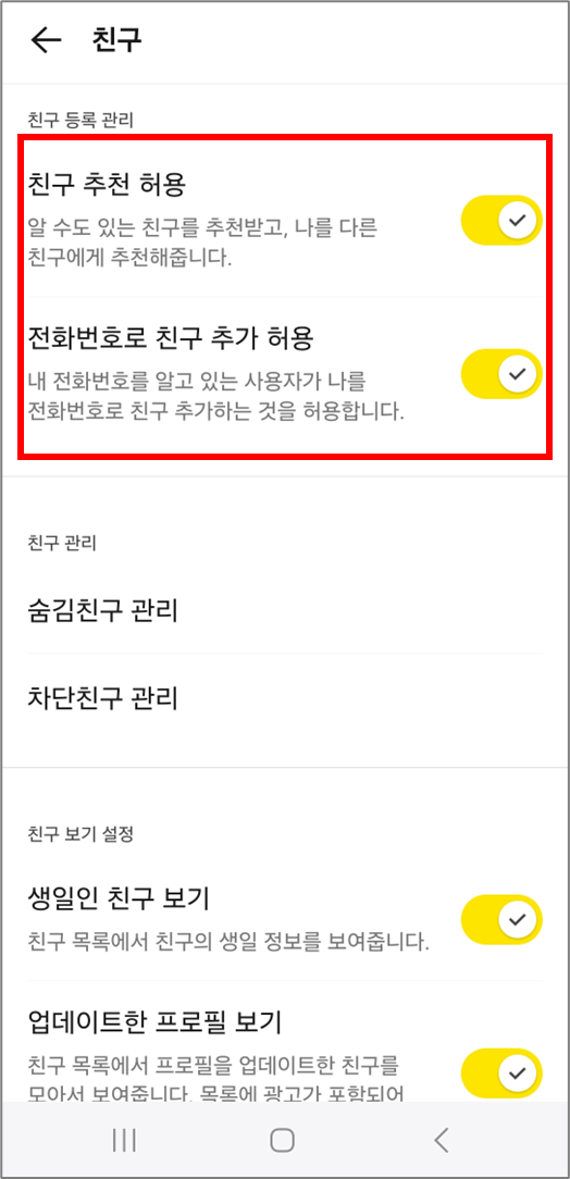 2. 카카오톡 친구 관리 설정에서 '전화번호로 친구 추가 허용'을 해제해 놓았다.