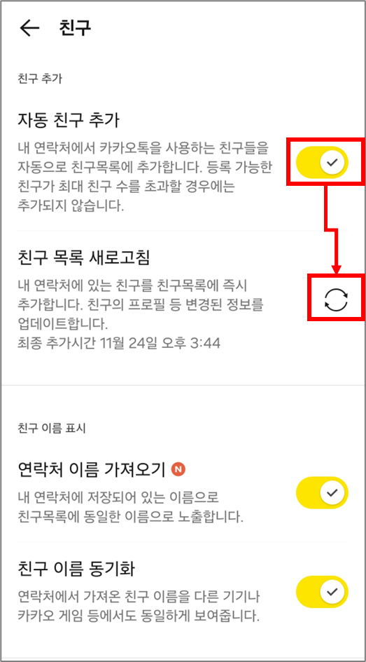 3) '자동 친구 추가'의 기능 열고, '친구 목록 새로고침'을 하면 빠르게 업데이트가 진행됩니다.