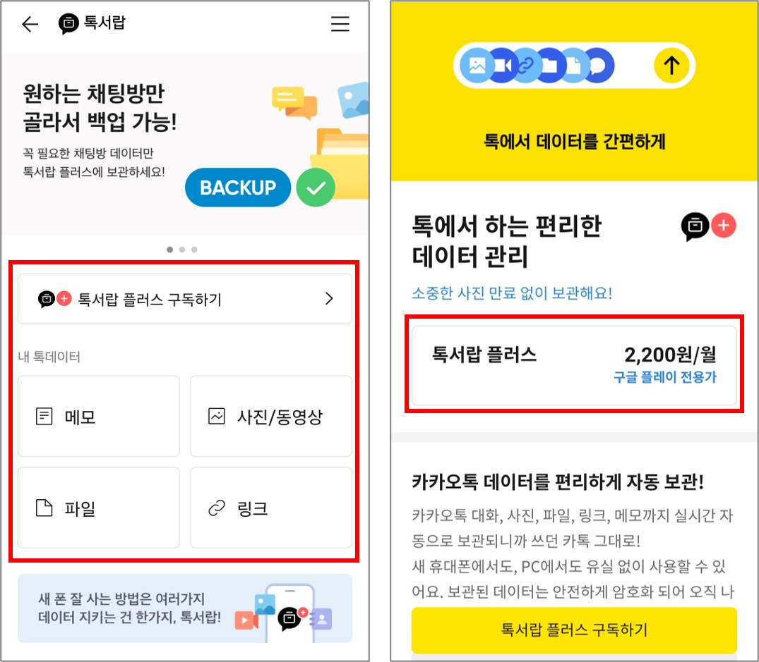 톡서랍 플러스의 경우 월 2,200원 사용료가 있지만