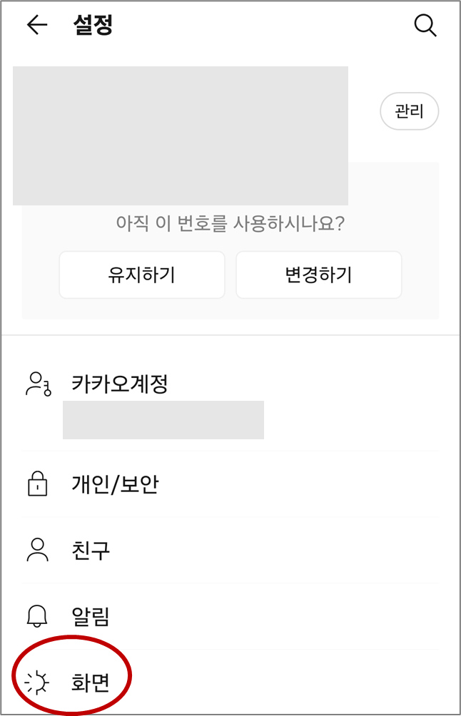 화면에 다양한 메뉴가 있죠? 이 중 카카오톡의 화면 설정을 지정해줄 수 있는 '화면' 메뉴를 눌러주세요.