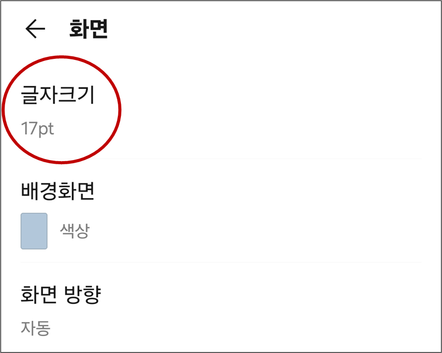 처음 기본 세팅은 17pt로 되어 있습니다. 내 폰에서 보이는 화면의 글자 크기인데 한번 바꿔볼께요.
