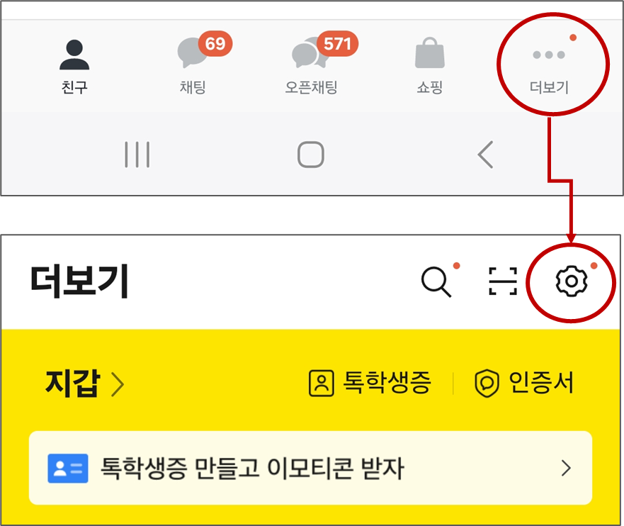 2. 더보기 화면의 우측 상단의 톱니바퀴(설정)를 눌러주세요.