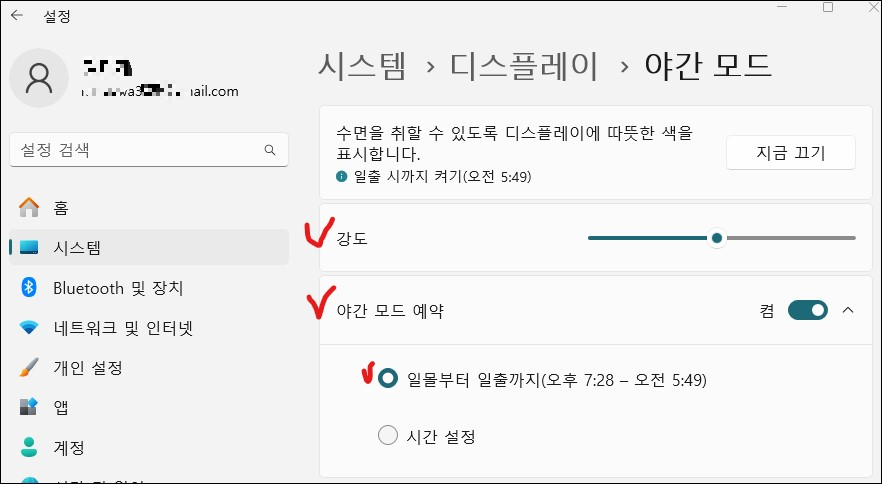 - '야간 모드'의 오른쪽 더보기 꺽쇠(설정)'을 클릭