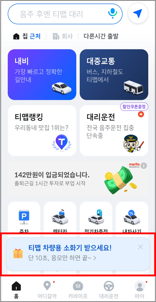 1. 핸드폰에 티맵을 설치한 후 앱을 열어주세요. 그럼 메인 화면에 '이벤트 배너'가 보입니다. 터치!