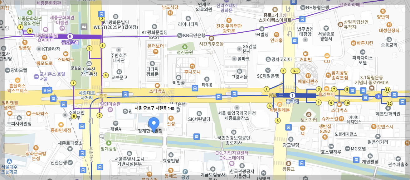 버스를 이용하실 경우, 청계천 또는 청계광장 정류장에서 하차하시면 됩니다.