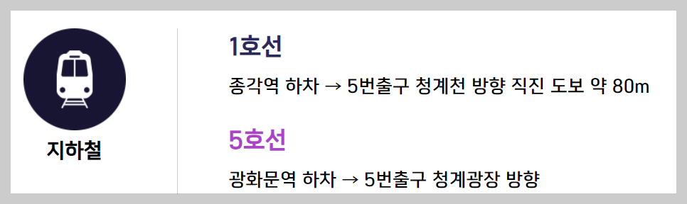 1호선 : 종각역에서 하차 후 5번 출구로 나와 청계천 방향으로 약 80미터 이동