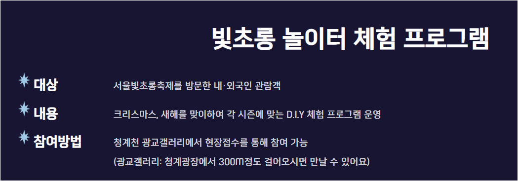 매일 저녁 6시부터 10시까지 열리며, 청계천 일대에서 다양한 빛 조형물과 프로그램을 즐길 수 있습니다.