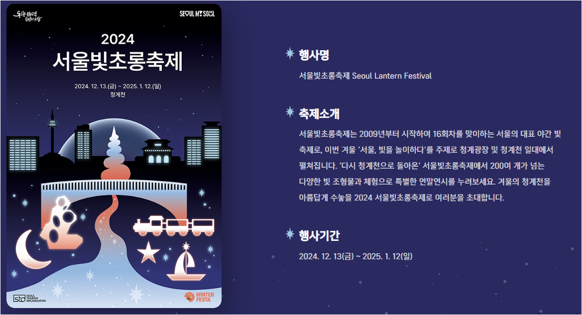 2024 서울빛초롱축제는 2024년 12월 13일부터 2025년 1월 12일까지 진행됩니다.